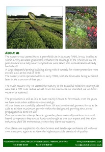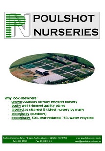 Trade only wholesale nursery in WiltshirePoulshot Nurseries is a TRADE ONLY wholesale nursery based in Wiltshire offering a wide range of outside container-grown Hardy Nursery stock: Shrubs, Shrubs on stem, Climbers, Perennials, Grasses offered in pot sizes mostly 3 liters, to twenty liters. Trade visitors and all enquiries welcome. Delivery throughout the south of England using our own nursery transport. |